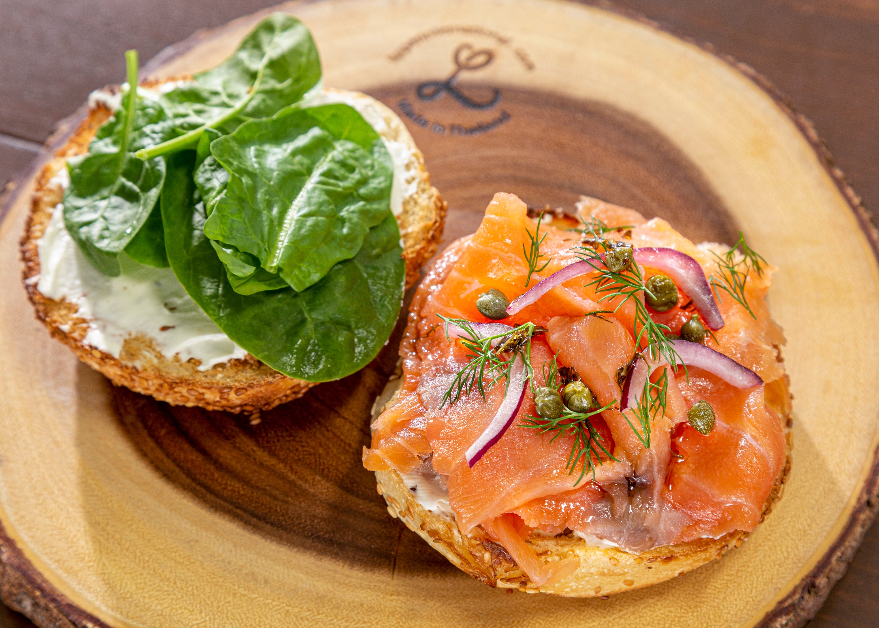 Sesame Bagel, cream cheese, smoked salmon, lettuce, capers, red onions, and house sauce